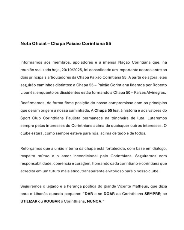 Em nota oficial, a Chapa 55 afirmou que continua “na trincheira de luta”, preservando os princípios que marcaram sua fundação e o compromisso de colocar o Corinthians acima de qualquer vaidade ou interesse particular. “A Chapa 55 leal à história e aos valores do Sport Club Corinthians Paulista permanece na trincheira de luta. Lutaremos sempre pelos interesses do Corinthians acima de quaisquer outros interesses”, diz o texto.