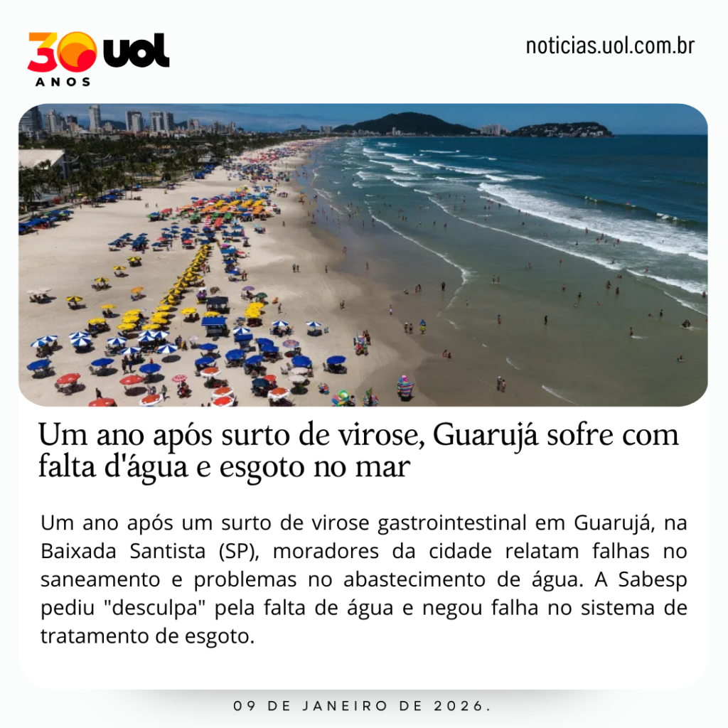 UOL | Um ano após surto de virose, Guarujá segue com falta d’água e esgoto no mar, alerta José Manoel
